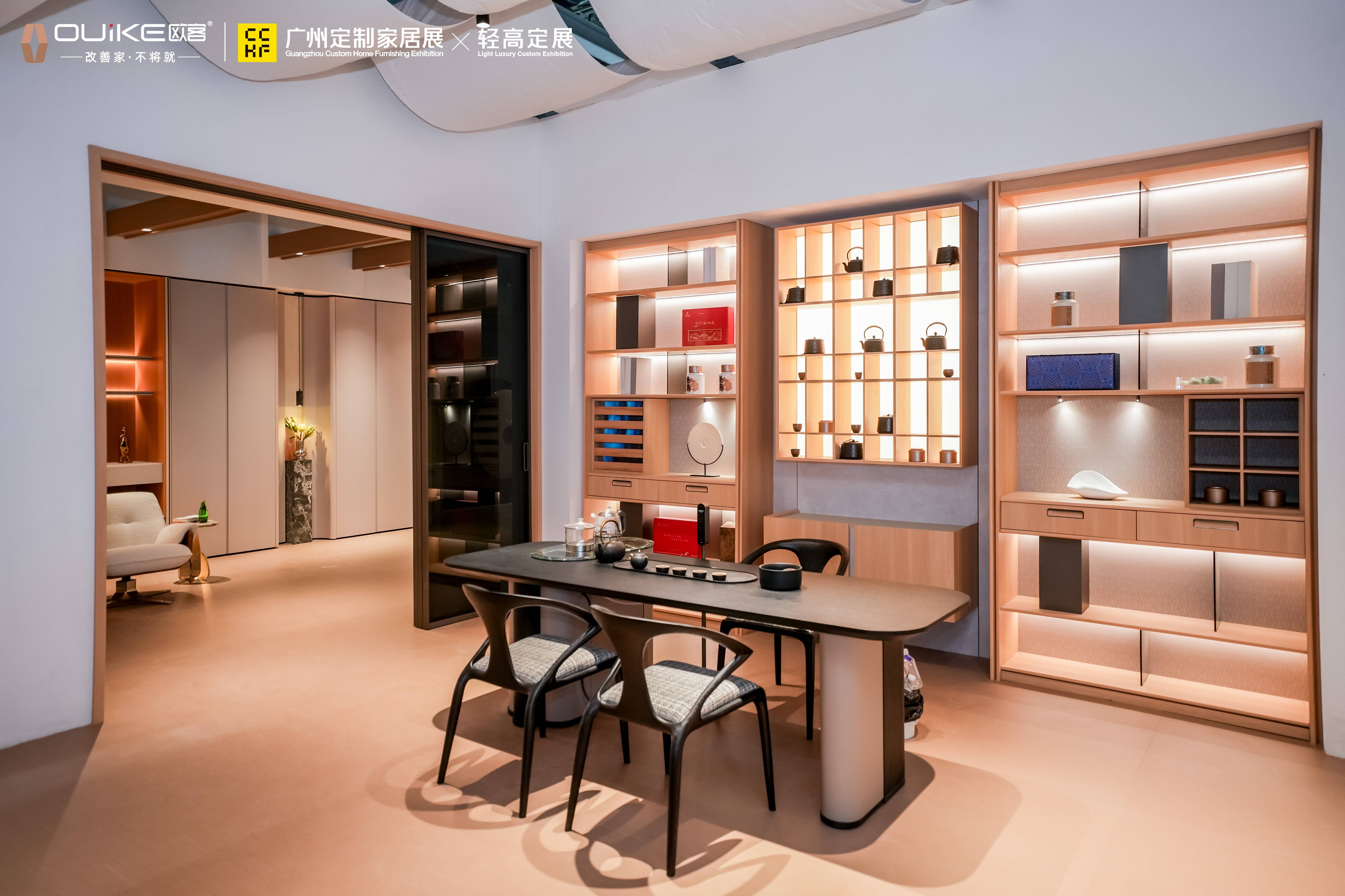 2026年广州定制家居展暨轻高定展现场,OUiKE欧客以 轻高定木作 新赛道先行者之姿初次重磅露脸,4E06 展馆内人流如织。金属圆管阵列复刻的竹林意象、退进式进口调配竹林造景的高雅布局,以及贯穿客厅、餐厅、厨房等全空间的模块化产品,生动诠释着,深化探寻这个沉积7年的品牌如何故木作思想添补商场空白,重构轻高定职业价值。